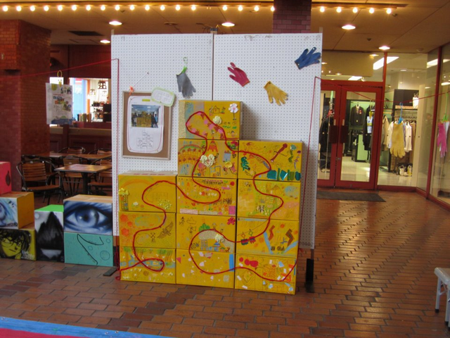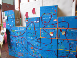 ダンボール1個1個を赤い毛糸の線路でつなぎ、子どもたちが描いた世界を旅する美術館です。