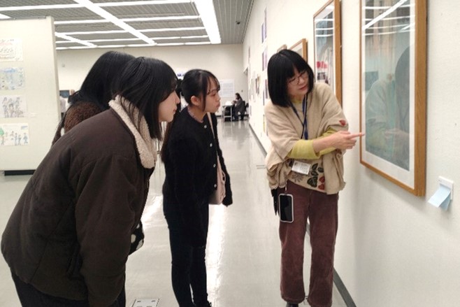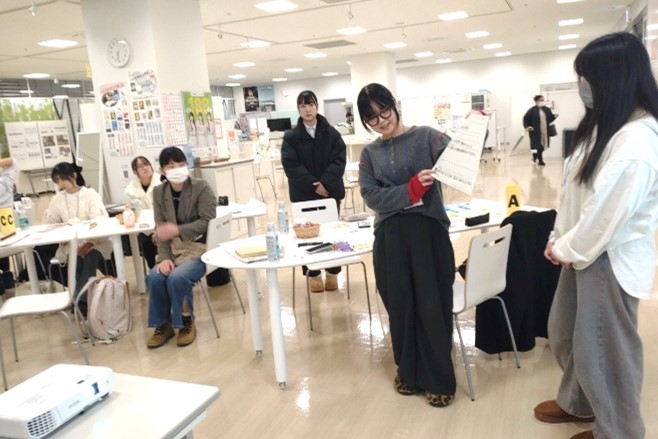 事業提案のアイデアに活かすため、学生メンバーを対象に、障がい者アート・子どもアート・現代アートを一堂に展示する「まるまるつながるアートてん まる」(県主催)の会場で、対話型鑑賞の体験会を開催しました。