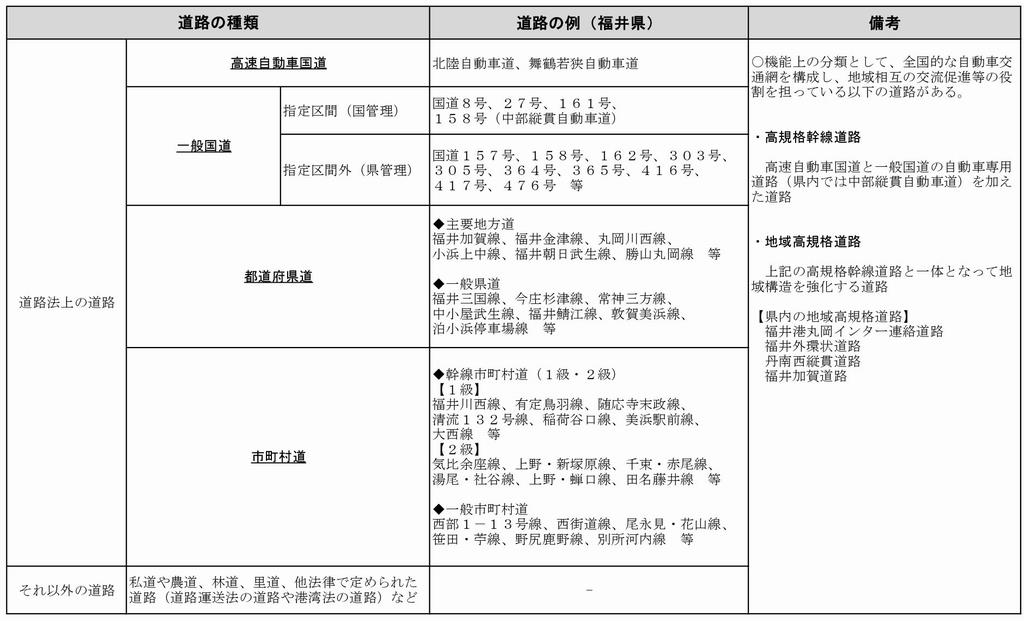 県内では、「福井港丸岡インター連絡道路」、「福井外環状道路」、「丹南西縦貫道路」、「福井加賀道路」が該当します。