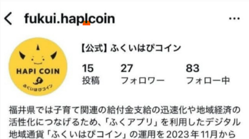 【注意喚起】デジタル地域通貨「ふくい はぴコイン」公式インスタグラムのなりすましアカウントが確認されました。