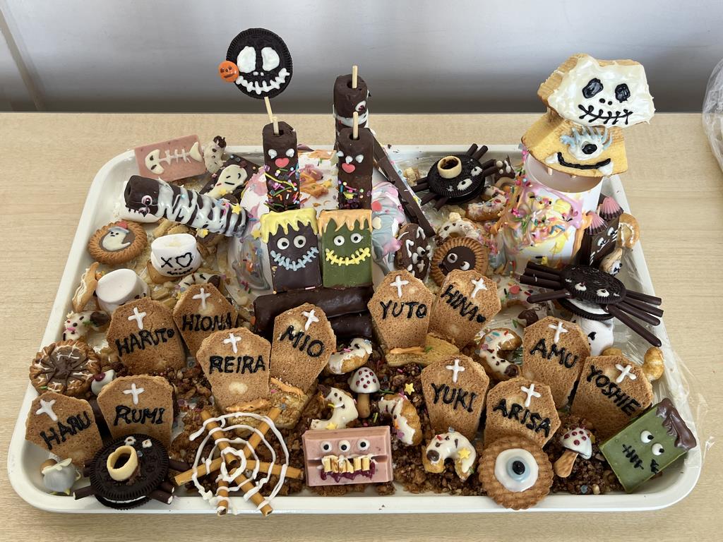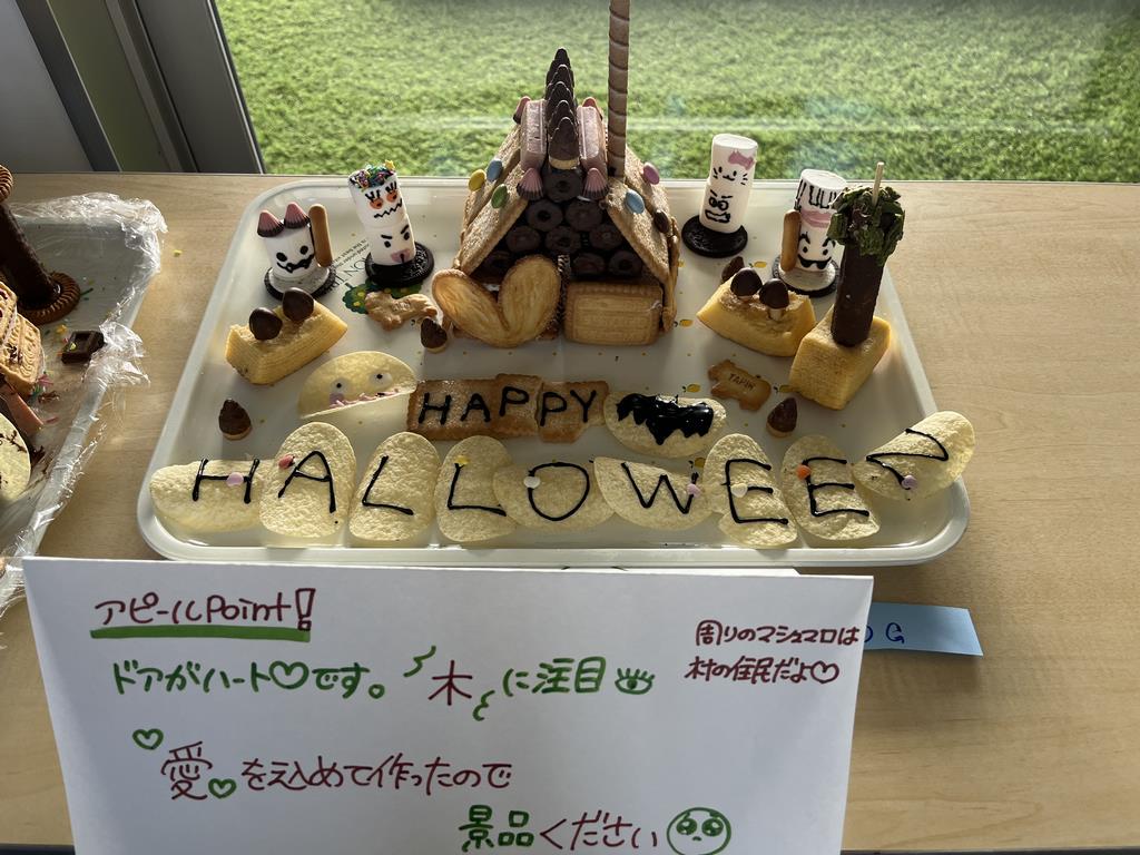 グループごとにアイディアを出し合い、自由奔放なお菓子の家を制作しました。
