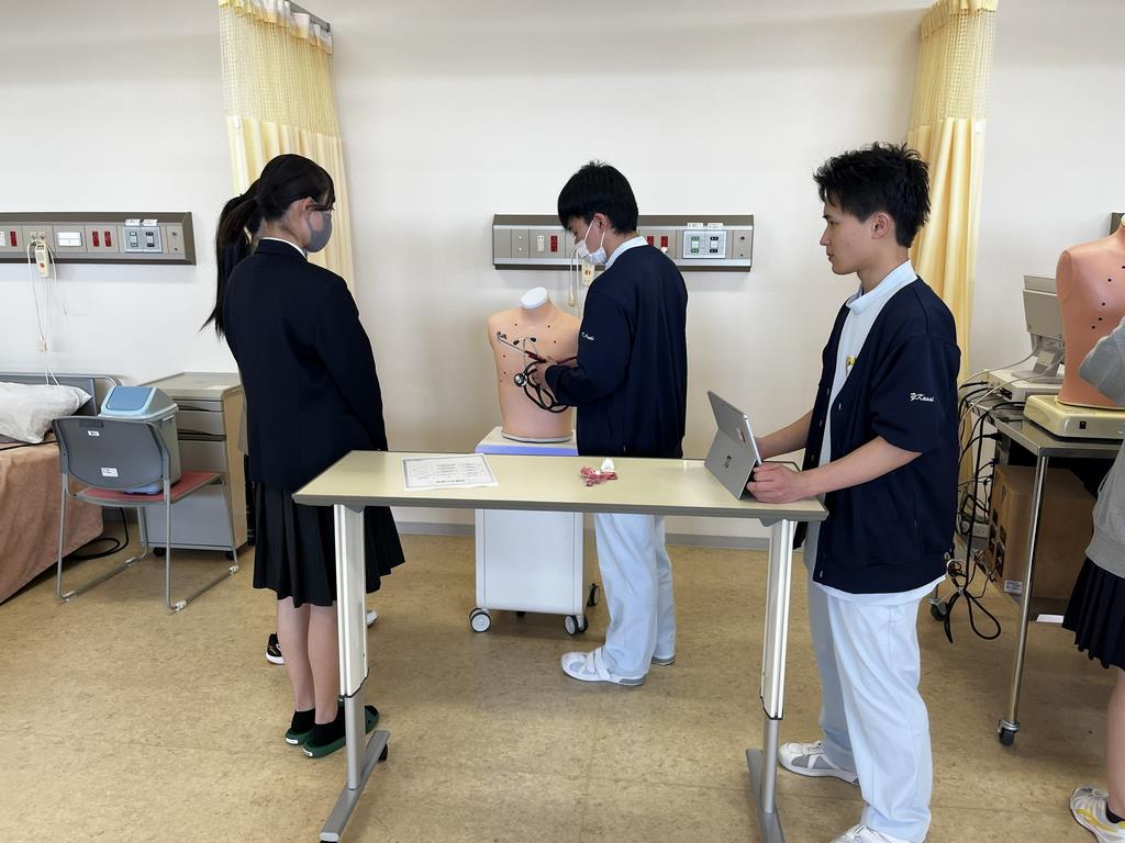シミュレーター(模擬患者)で、在校生と一緒に聴診器を使って心臓や呼吸の音を聞いてみました。