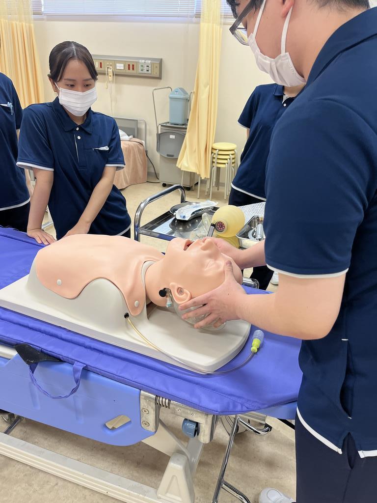 リアルな模型を相手に、気道確保、気管チューブ挿入の介助方法、心臓マッサージやAED使用等を実施しました。