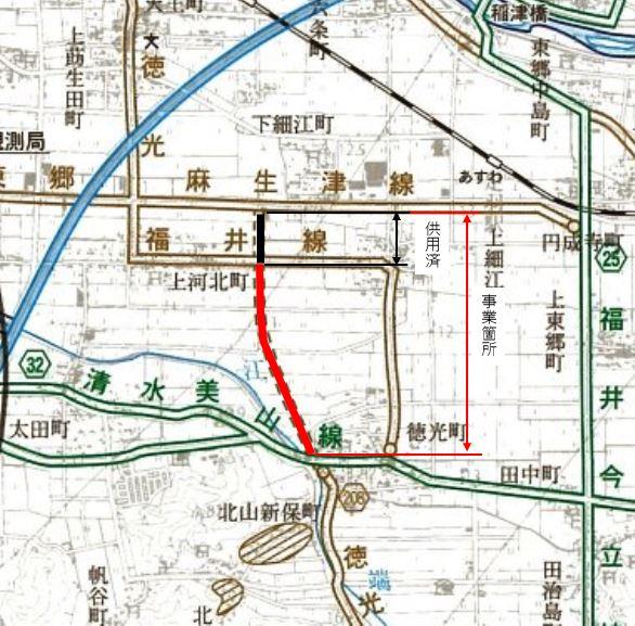 一般県道徳光福井線は、福井市徳光町から福井市市街地に至る主要幹線道路です。 徳光町~下細江町の約2.6km区間の現道は、幅員狭小で線形がクランク状となっており、通過交通により通学路や生活道路の安全性が損なわれています。
