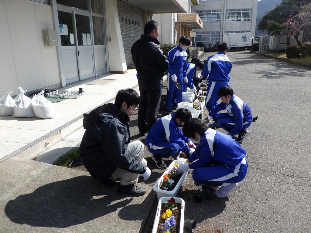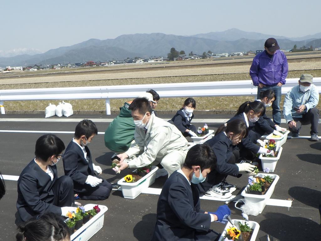 当該区間の供用にあたり供用前日までに地元の上文殊小学校、文殊小学校において道路がどのように整備されるのかということで出前授業を実施しました。また供用に花を添えていただくためプランターに花を植えていただきました。上文殊小学校の生徒さんには出前授業当日に、文殊小学校の生徒さんには供用日当日に花の植栽を実施していただきました。供用日当日は地元の方向けに歩行者の方たちに限り開放し、文殊小学校の生徒さんが花の植栽をした後にみんなで記念撮影をしました。