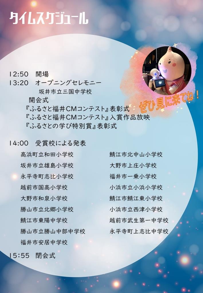 発表校はこちら ・フェア参加の皆さんは、開始時刻13:20までに受付および着席願います。講堂の座席表は1月下旬にお知らせいたします。