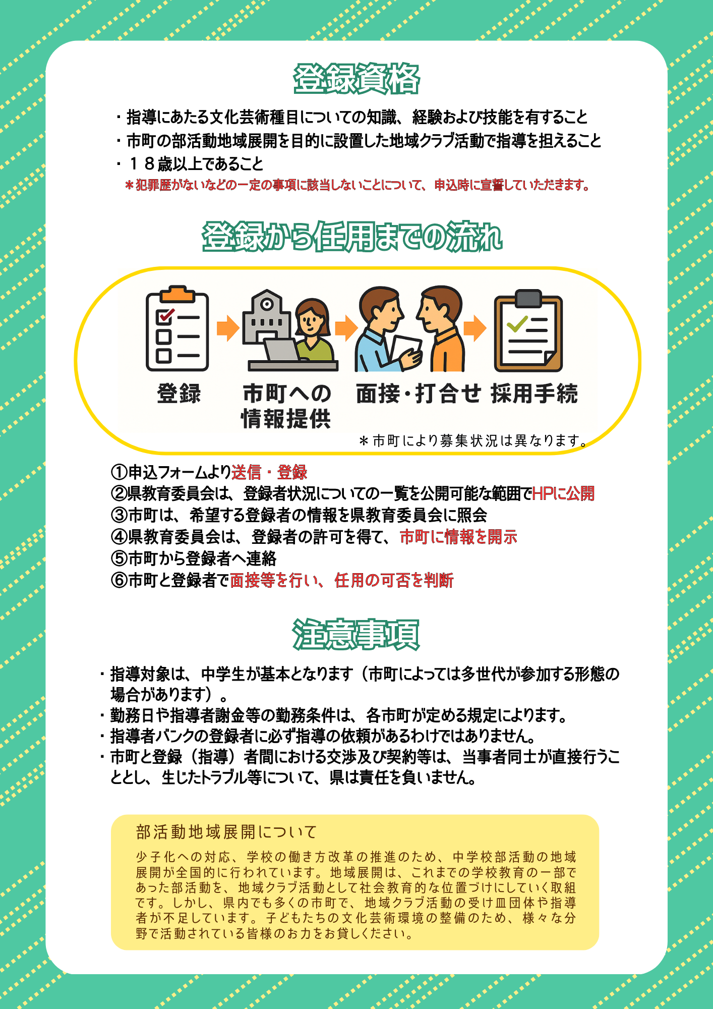 現在、全国で進められている中学校部活動の地域展開は、これまでの学校教育の一部であった部活動を、地域クラブ活動として社会教育的な位置づけにしていく取組です。そのため、地域社会全体でこの取組を推進していく必要がありますが、多くの市町で、地域クラブ活動の受け皿団体や指導者が不足しています。子どもたちが文化芸術活動に継続して親しむことができるよう、様々な分野で活動されている、地域の皆様のお力をお貸しください。