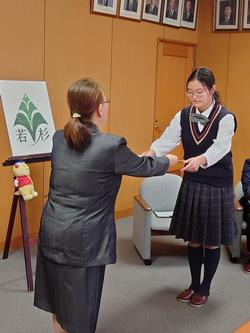 当日は作成者の方にもご参加いただき、県教育委員会から感謝状を贈呈しました。また、作成者様には校章に込められた思いなどを語っていただきました。その思いに応えられるよう、職員一同、精一杯頑張っていきます。