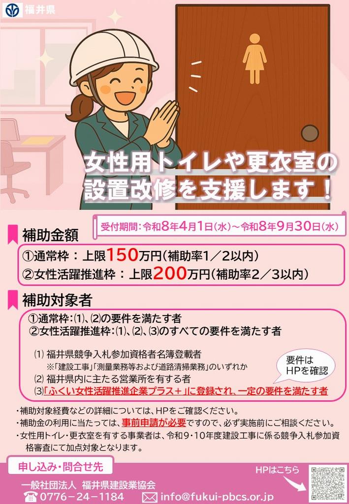 ※女性用トイレ、女性用更衣室の設置改修以外の女性活躍のための支援については「就業環境等改善事業補助金」をご確認ください。