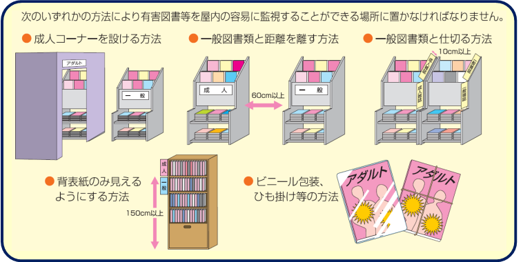 また、図書等の販売業者等には、有害図書が青少年の目に触れないよう、図書等の区分陳列を義務付けています。