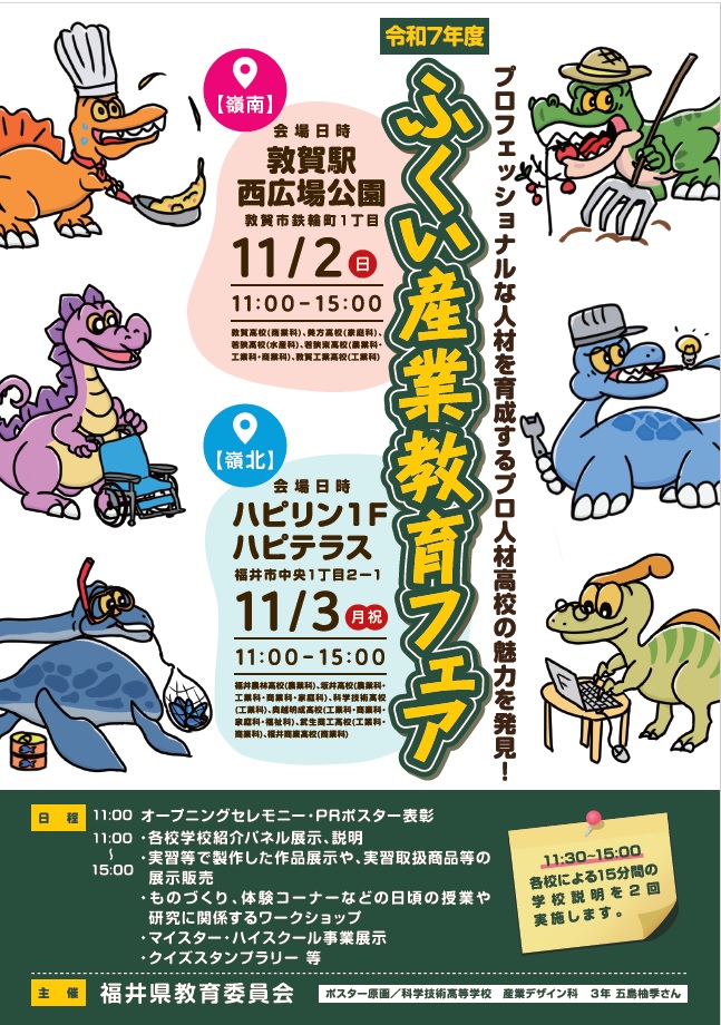 県内の職業系高校の各学科(農業、工業、商業、水産、家庭、福祉、総合、看護)の専門的分野を学ぶ生徒たちが、日頃の学習や研究の成果を発表する機会を設け、広く職業系高校の魅力を広く伝えるため、「ふくい産業教育フェア」を開催しました。