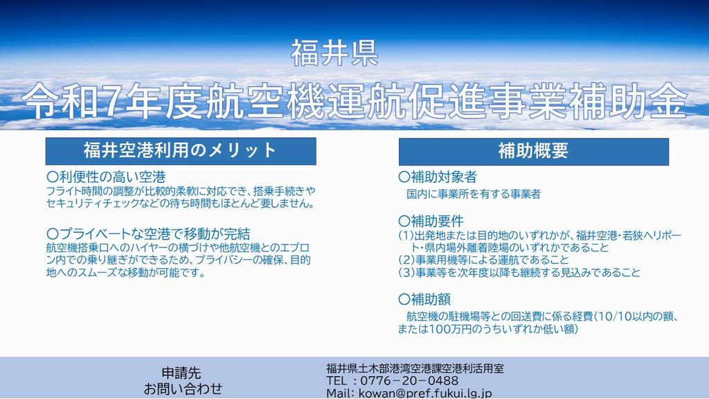 この補助金は、福井空港、若狭ヘリポート、県内場外離着陸場において航空機を利用する事業者に対して経費の一部を補助し、航空機を活用した産業活動の活性化や、福井空港等の利用促進を図ることを目的とする。