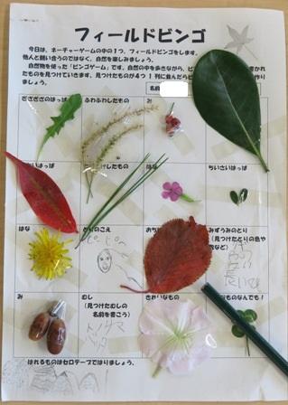 〔フィールドビンゴ〕 パン作りの合間(発酵中の時間)を利用して、秋探しのフィールドビンゴをしました。 いろんな秋をバッチリ見つけられました。 |