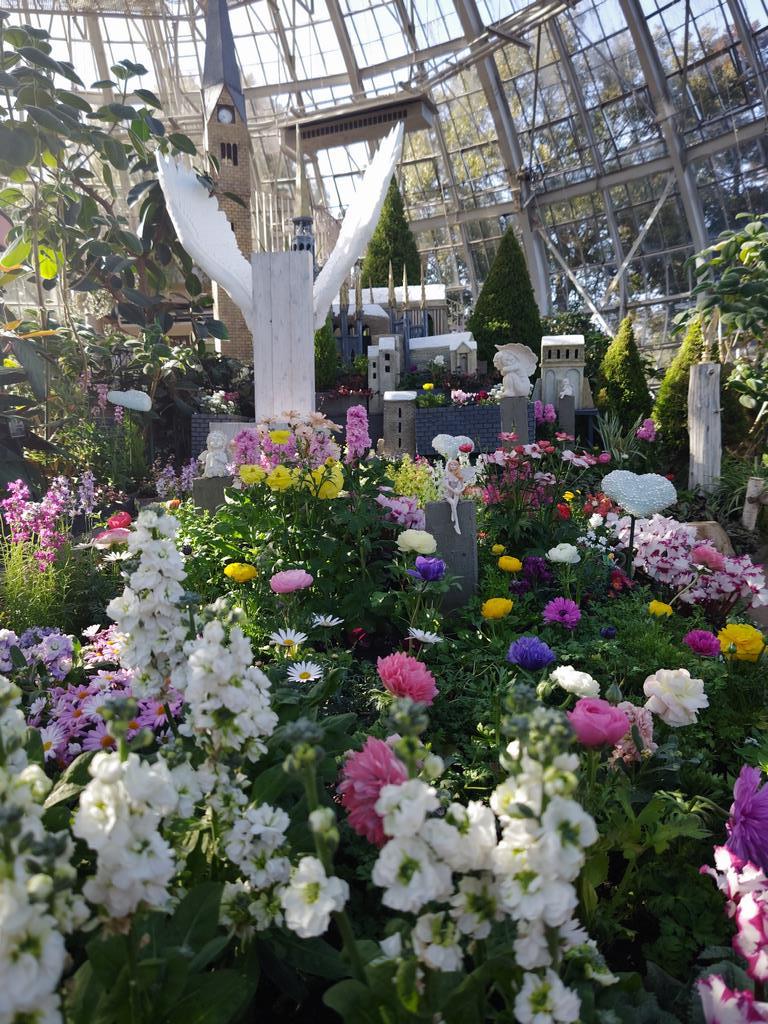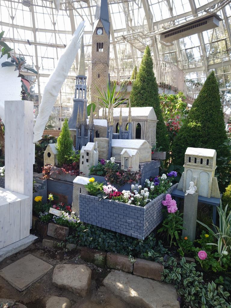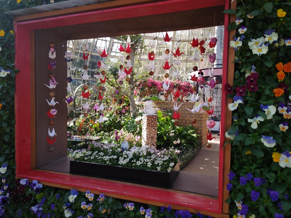 花の展示温室は「春のメルヘン&ワンダーガーデン」をテーマに模様替えをしています。ピンクや黄、白の春らしい色合いのラナンキュラスやリナリア、金魚草などの花を展示しており、一足早く春の風景を見ることができます。
