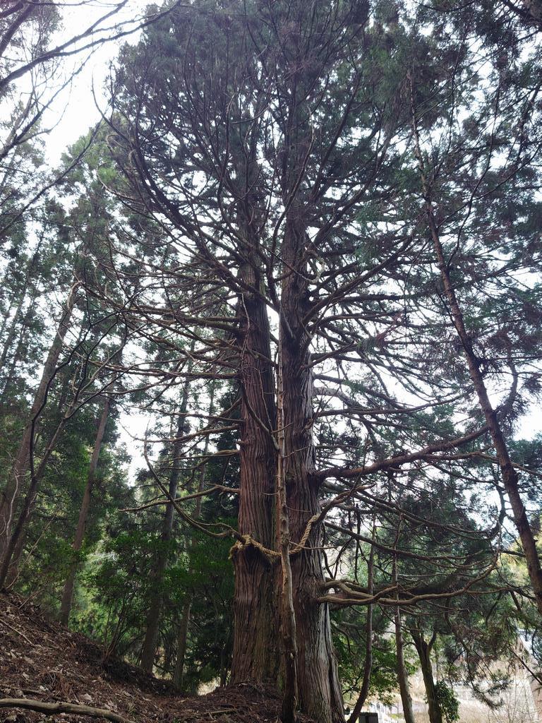 国道365号線八田トンネルの東側、越前市北山町との境に樹高約30メートル、幹回り約8メートルの二本の大杉がそびえています。紀元前の崇神天皇の時代、諸国平定のため北陸に派遣された大彦命が住民から献上された餅を食した後、地に刺した箸が芽をふき、みるみるうちに二本のスギになったという伝説があります。二本が寄り添うように上に伸びる様は見応えがあります。