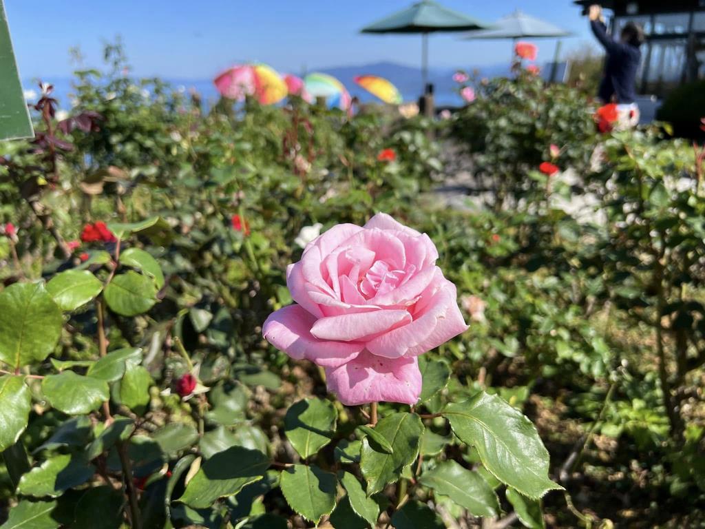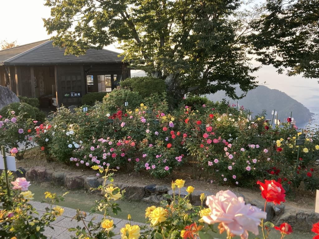 美浜町と若狭町にまたがるレインボーライン山頂公園は三方五湖の美しい大パノラマと恋人の聖地で知られています。毎年、春と秋に約110種600株のバラが咲き誇ります。秋のバラは形が乱れにくく色が長持ちするのが特徴であり、若狭湾や三方五湖の青や木々の緑とのコントラストが楽しめます。現在、ローズフェアが開催されています(11月24日(月・振休)まで)。