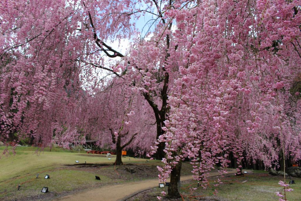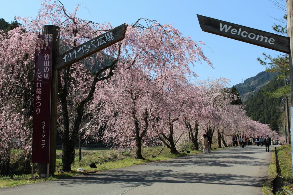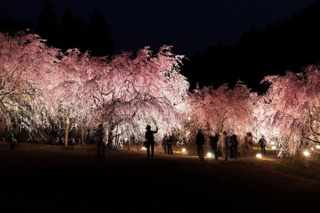 たけくらべ広場では、約180本あるしだれ桜の美しいピンク色の花を見ることができます。広場以外の道路沿いや民家の庭などを含めて地区全体で約700本以上植えられており、あちらこちらで桜の花を楽しむことができます。4月4日~4月18日には「竹田の里しだれ桜まつり」が開催され、ライトアップされた神秘的な世界を見ることができます。(ライトアップ18:30~21:00)