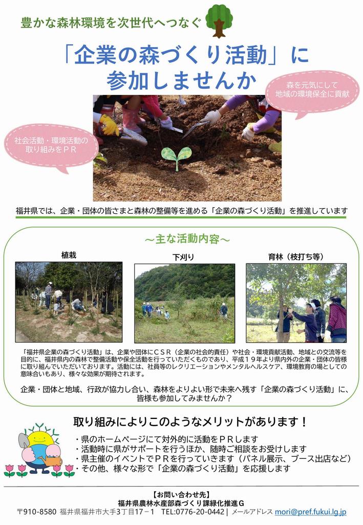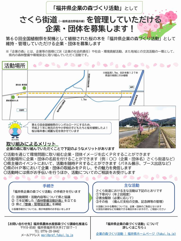 現在、この桜の木を守る活動を実施していただける企業・団体を募集しています。この活動は「福井県企業の森づくり活動」として行っていただくもので、環境美化などへの取り組みを広くPRすることができます。