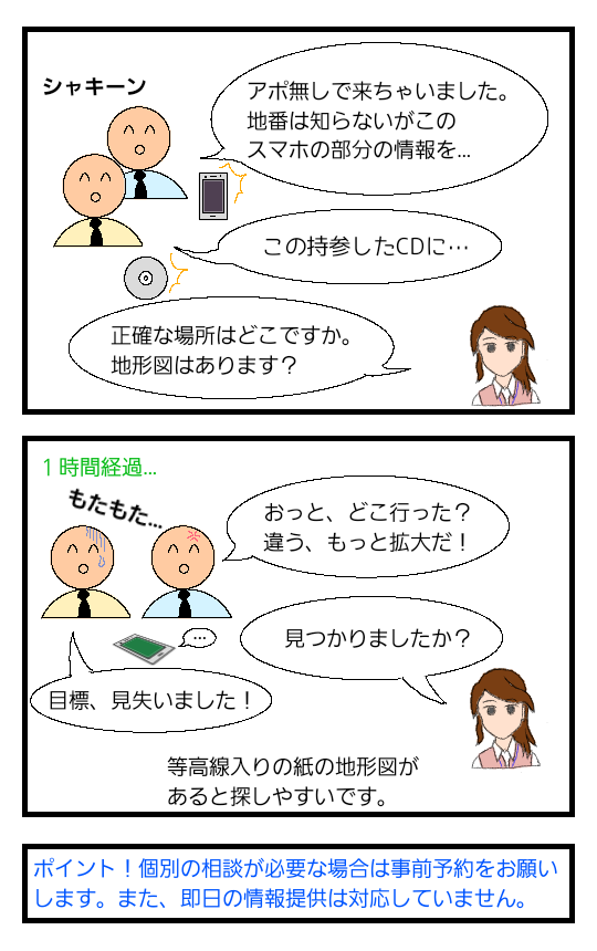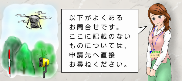 A24 県の管理する図面と仕様が異なっていたり、周辺に目印となる施設や等高線の記載がなかったりする等、地番の照合が困難な場合が多いため、お受けしておりません。「正確な位置は把握しているが申請する地番が分からない」という場合は、申請窓口に直接お越しの上、ご相談ください。