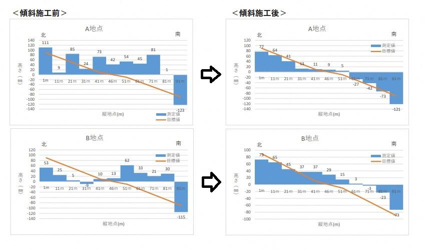 慣行区は全体的に水が溜まっていたが、傾斜施工区は低いほうに水が溜まっていました。