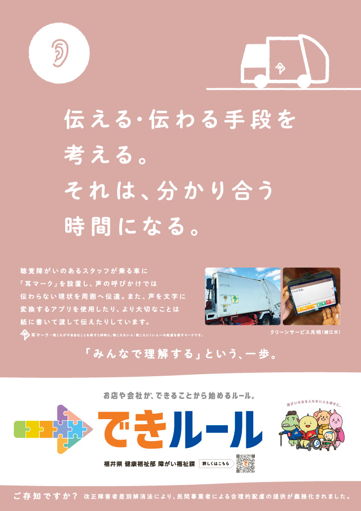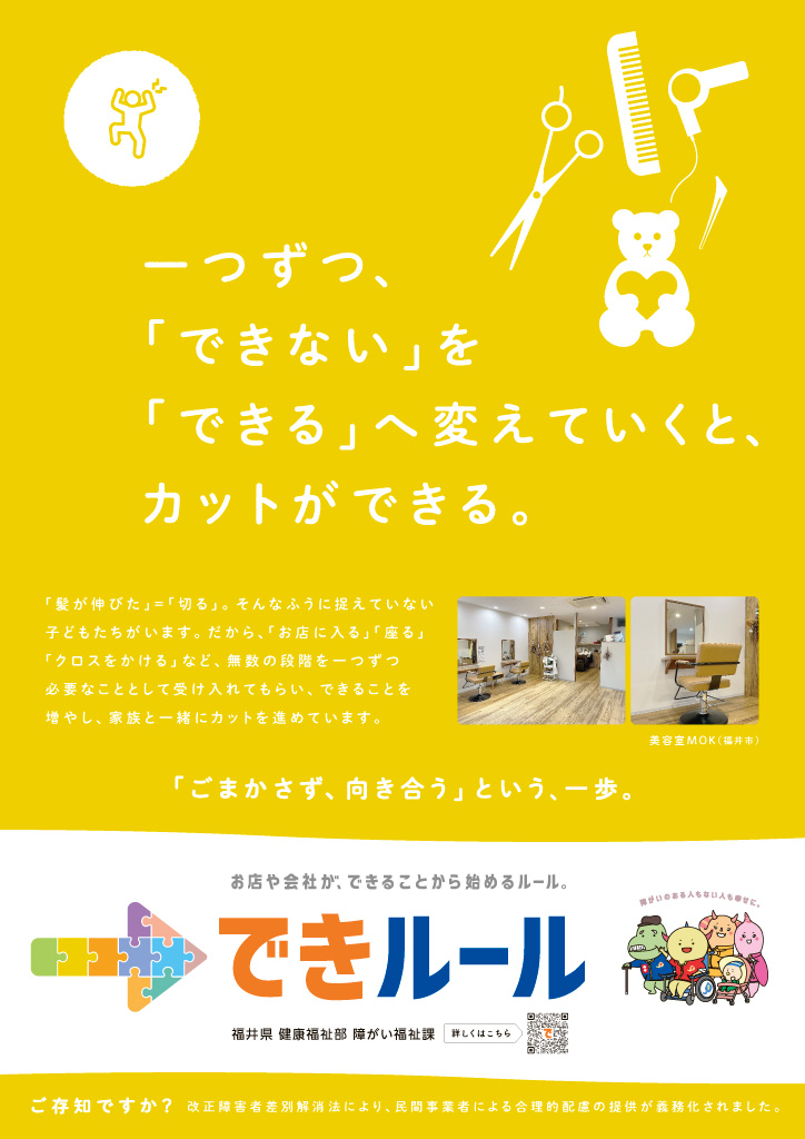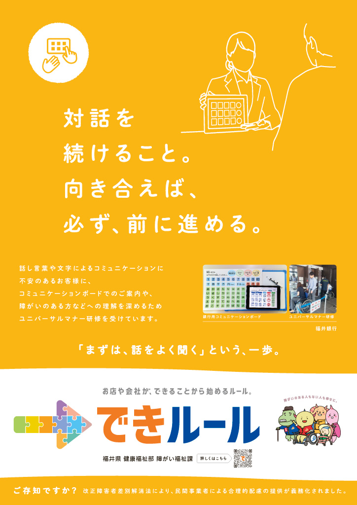 令和6年4月に改正障害者差別解消法が施行され、事業者による障がいのある人への合理的配慮の提供が義務化されました。福井県では、「合理的配慮の提供」について、障がいのある人と事業者との対話の中で、それぞれの会社やお店等において”できることから始める” ”まず第一歩を始めていく” ルールを、「できルール」という言葉で広めています。