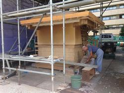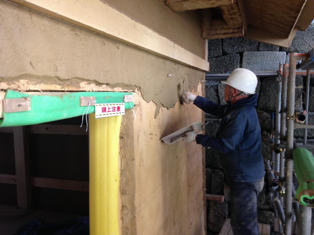 工場での木材の加工や石瓦の製作に加えて、 現場では、基礎工事を実施しました。土塀のモックアップには、下地の上に荒壁塗りを行いました。