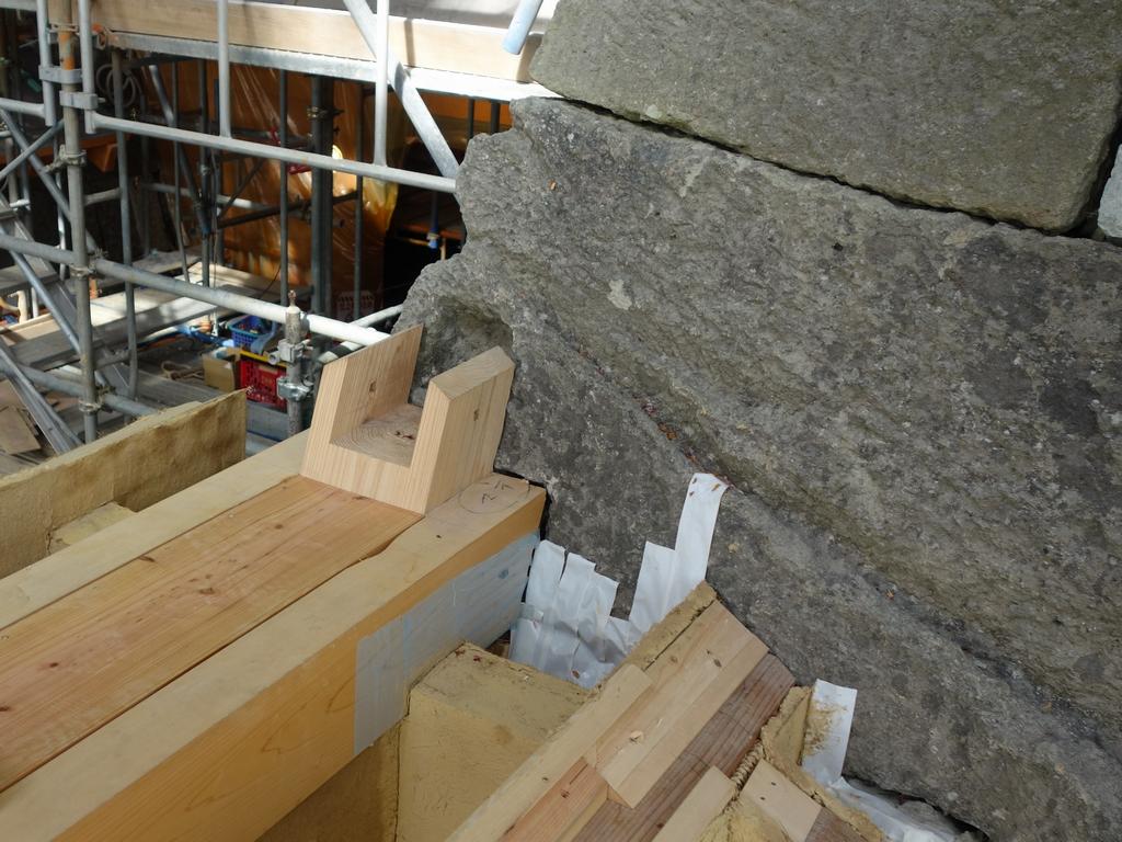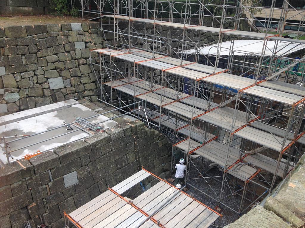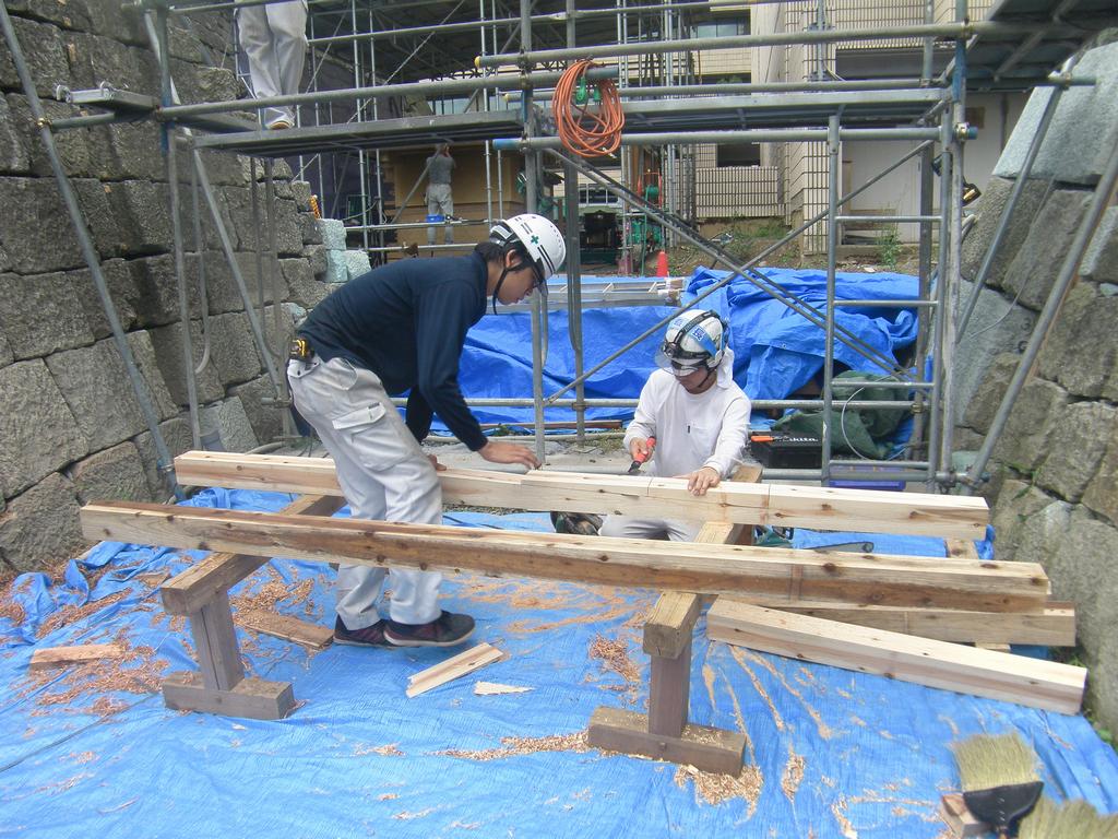 土塀を設置する石垣の雁木部分の積み直し、木材の加工、建方工事のための足場の設置を行いました。10月からは、いよいよ柱や梁の据え付けが始まります。土塀のモックアップには、中塗り、砂漆喰塗りを行いました。