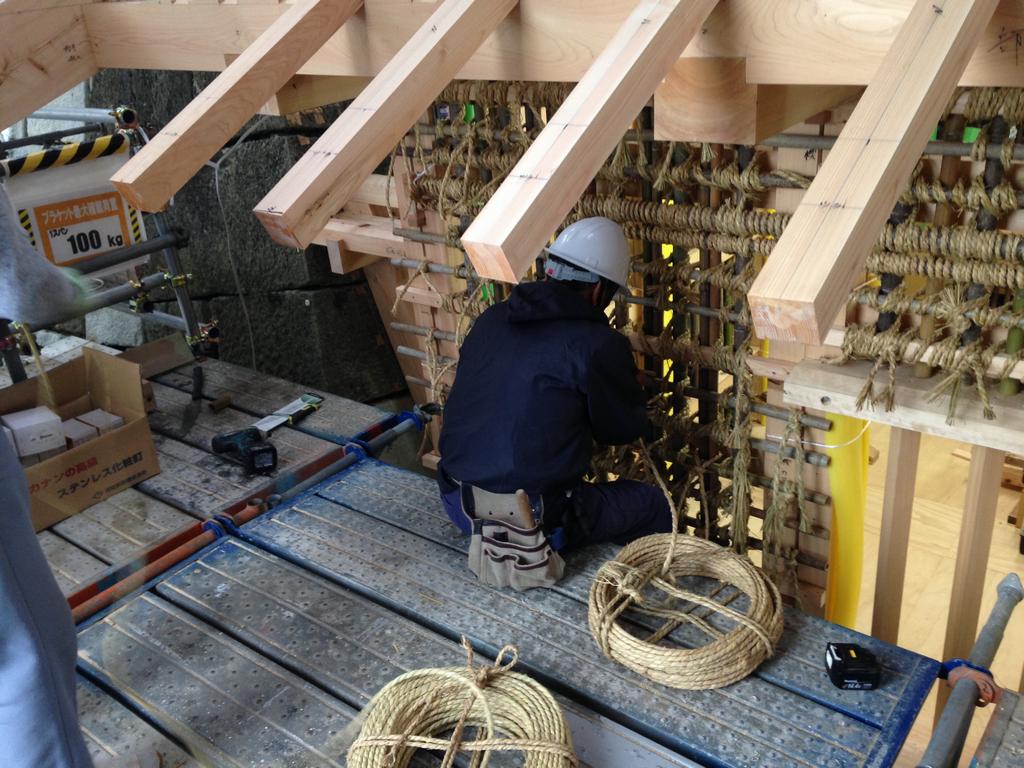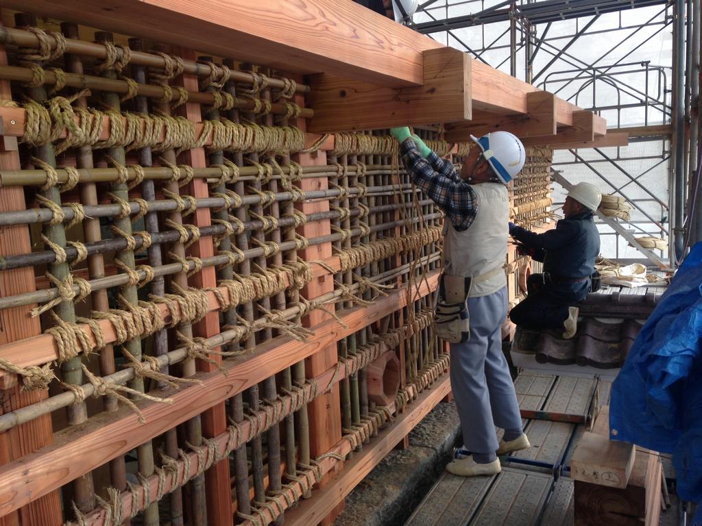 引き続き、御門の材料となる木材の製材や石瓦の製作を行っています。現場の土塀のモックアップには、丸竹をわら縄で編み込み土塀の下地を作る作業(丸竹小舞掻き)を行いました。
