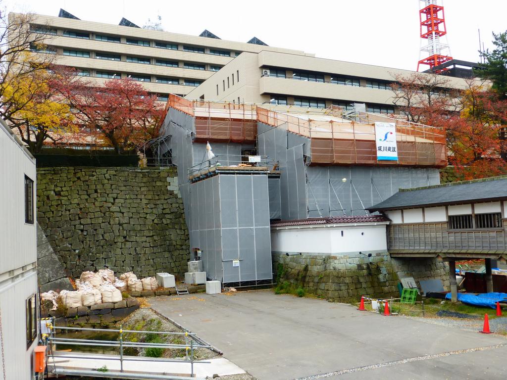 櫓門では、石瓦葺き工事と、内部からの土壁の裏返し塗りを始めました。棟門では基礎工事を行い、土塀では枡形の内側にも土壁の下地となる木舞を組んでいます。