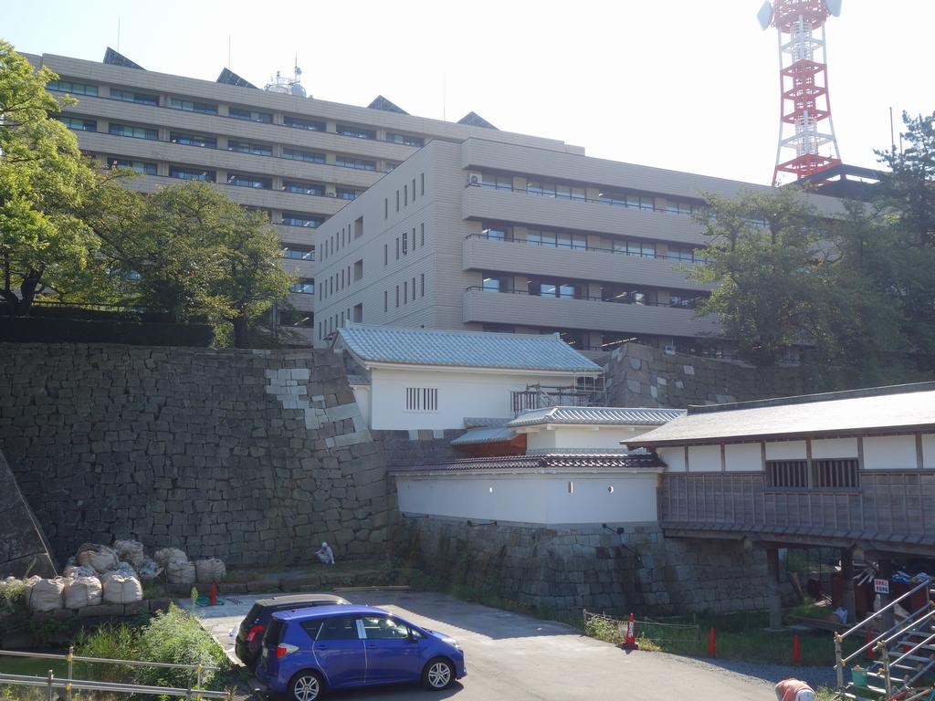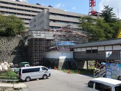 櫓門の石瓦葺き工事が完了し、床板張りを順次施工しています。棟門では、石瓦葺き工事に着手しており、土塀においては、内部側の荒壁が完了し屋根組み工事を行っています。