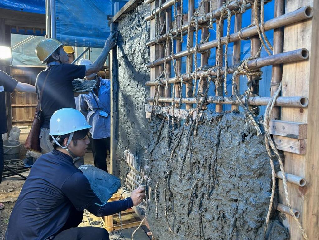 [研修会]特論「文化財の設計監理」、実測調査(米蔵梁)、土壁塗体験(小舞・荒壁付け)