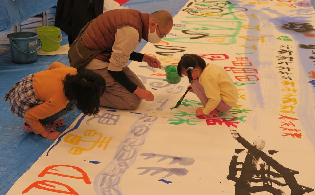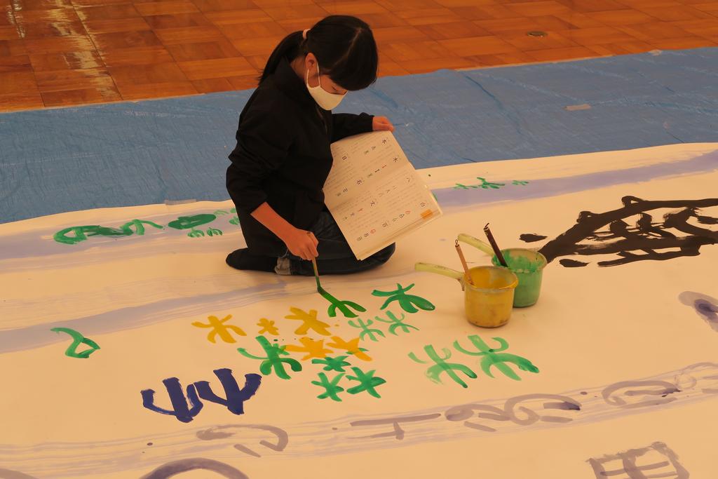 また、会場中央では、2メートル×10メートルの大きな紙を床に広げ、草・水・川・月・石・魚・雲・田・牛・・・・など、たくさんの古代文字を取り上げ、色とりどりに書いて、不思議な森羅万象の世界を作り上げました。