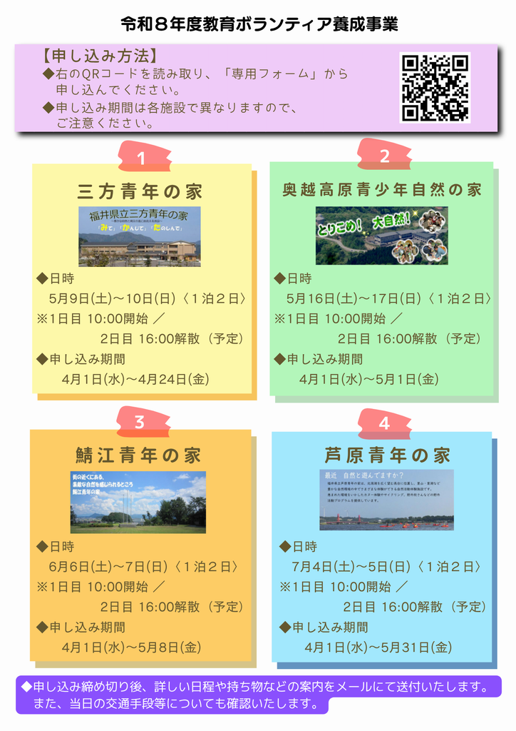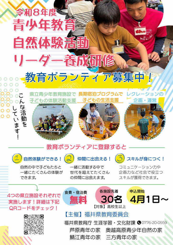 各施設の主催事業や7・8月に実施する「令和8年度ふくいの自然・宿泊体験による子どもたちの交流事業 」等で活躍しています。