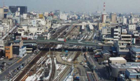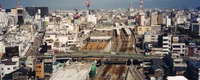 写真中央部で横断している道路が城の橋線です。跨線橋撤去の様子がわかります。