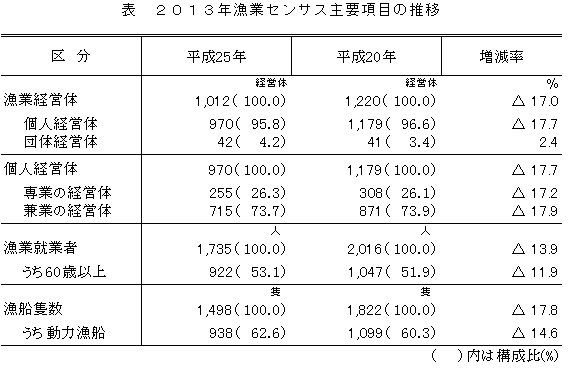 2013年漁業センサス調査結果(海面漁業調査漁業経営体調査)