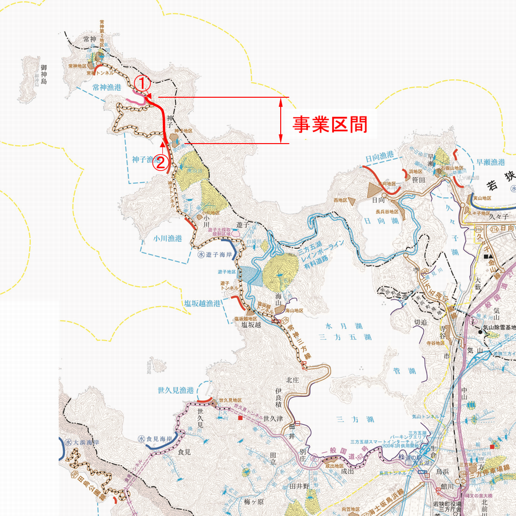 一般県道常神三方線は、若狭町常神から若狭町三方までの延長約21kmの県道です。 当路線は連続する漁業集落と若狭町中心部を結ぶ重要な生活道路であるとともに、若狭湾国定公園内の常神半島を縦貫する観光ルートにもなっています。しかし、本事業区間は、幅員が狭小で線形不良の未改良区間が多いうえ、地形が急峻なため、これまでに幾度となく豪雨災害により道路が寸断され、その度に半島先端側の集落が孤立するなど、災害に対し脆弱となっています。