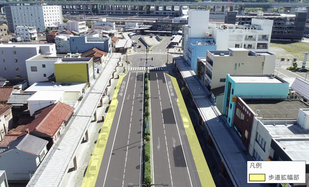 令和6年3月の北陸新幹線敦賀駅開業にあわせて、歩道を広げ多目的に利活用できる道路空間を整備することで、交流と賑わいの創出を図ります。