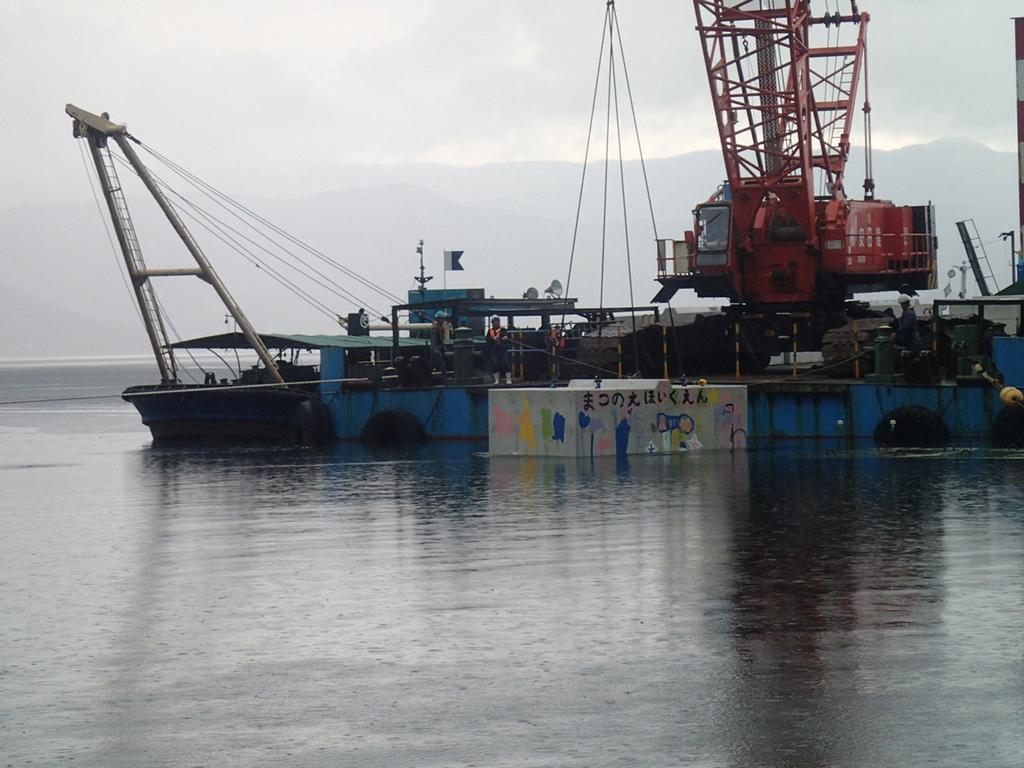 令和2年7月31日(金)、お絵描き体験で鮮やかに彩られたコンクリートブロックが、縄間海岸の海中に設置されました。園児の思いを乗せたブロックは、離岸堤の一部として、縄間地区の住宅や海岸を強い波から守ります。