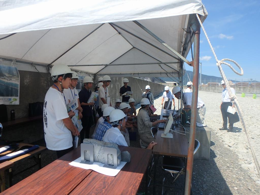 参加者は、ふ頭用地埋立工事の現場で工事の様子を見学しながら、敦賀港や土木職の仕事の説明などを聞きました。
