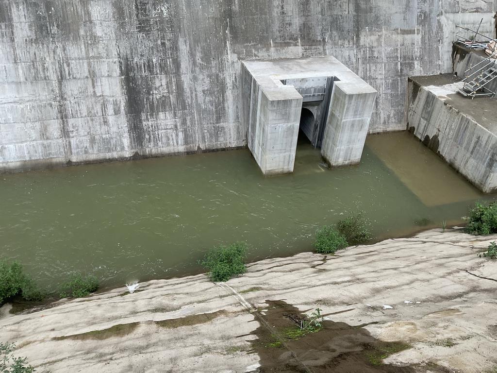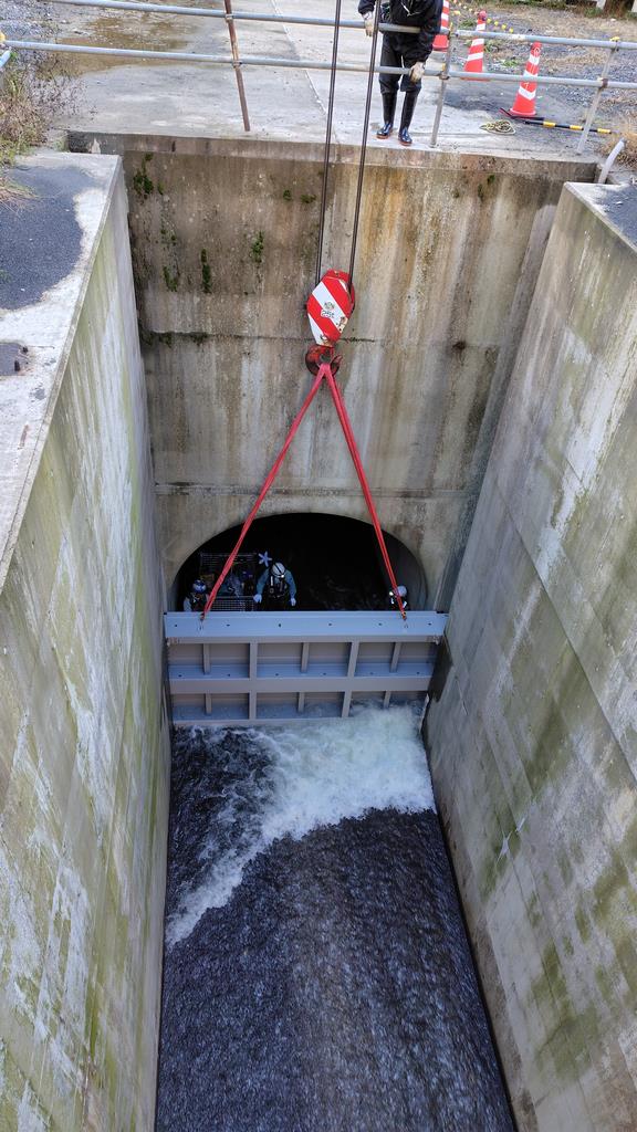 転流工(仮排水路トンネル)吞口を閉鎖し、川の流れを堤内仮排水路に通す二次転流を実施しました。