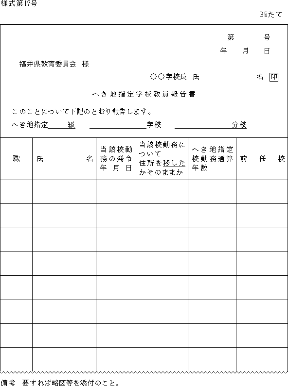様式第17号に定めるへき地学校勤務者報告書を、4月3日までに、委員会を経由して県委員会に提出しなければならない。