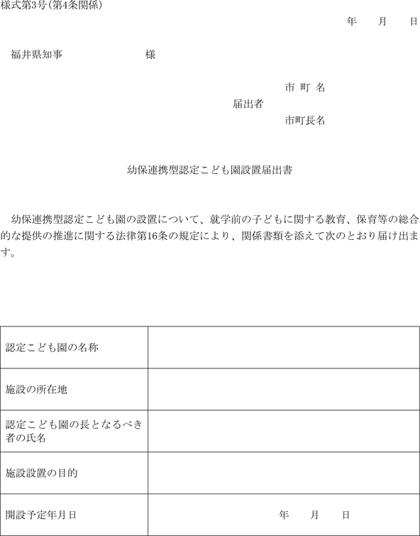 第四条 法第十六条の規定による設置の届出は、幼保連携型認定こども園設置届出書(