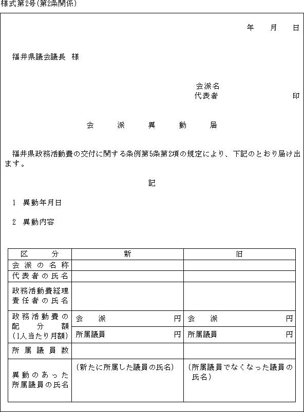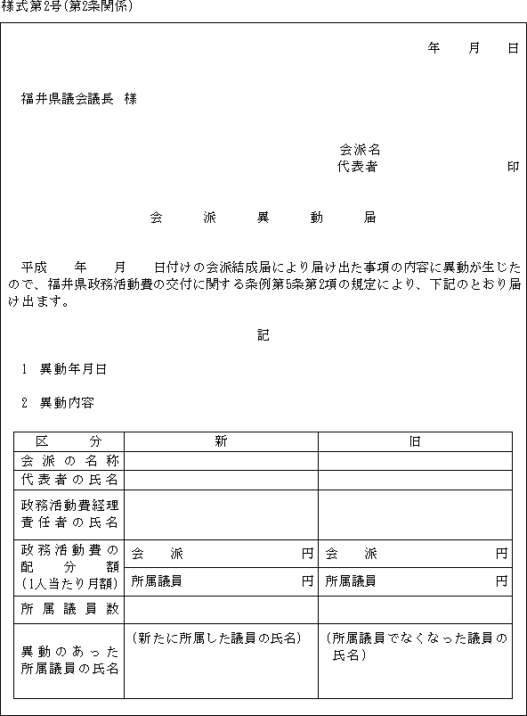 2 条例第5条第2項の規定による届出は、会派異動届(様式第2号)によりするものとする。