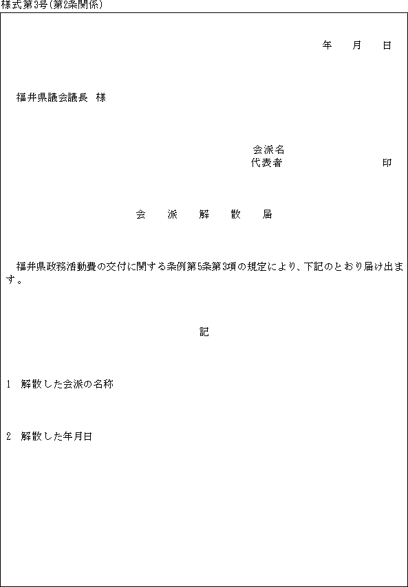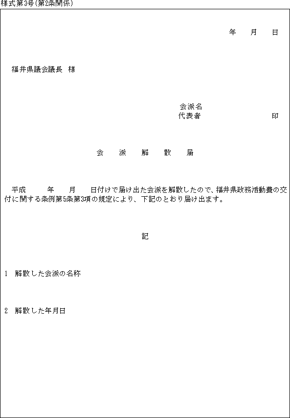 3 条例第5条第3項の規定による届出は、会派解散届(様式第3号)によりするものとする。