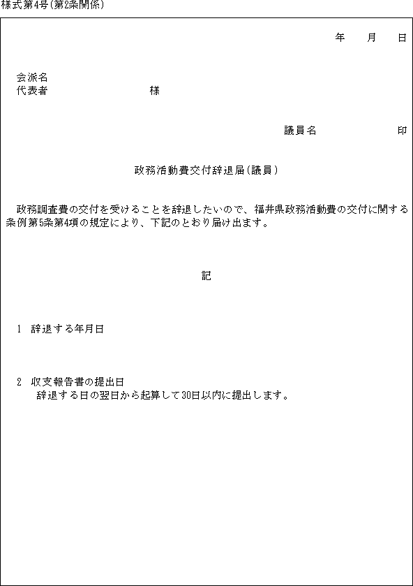 4 条例第5条第4項の規定による届出は、政務活動費交付辞退届(議員)(様式第4号)によりするものとする。