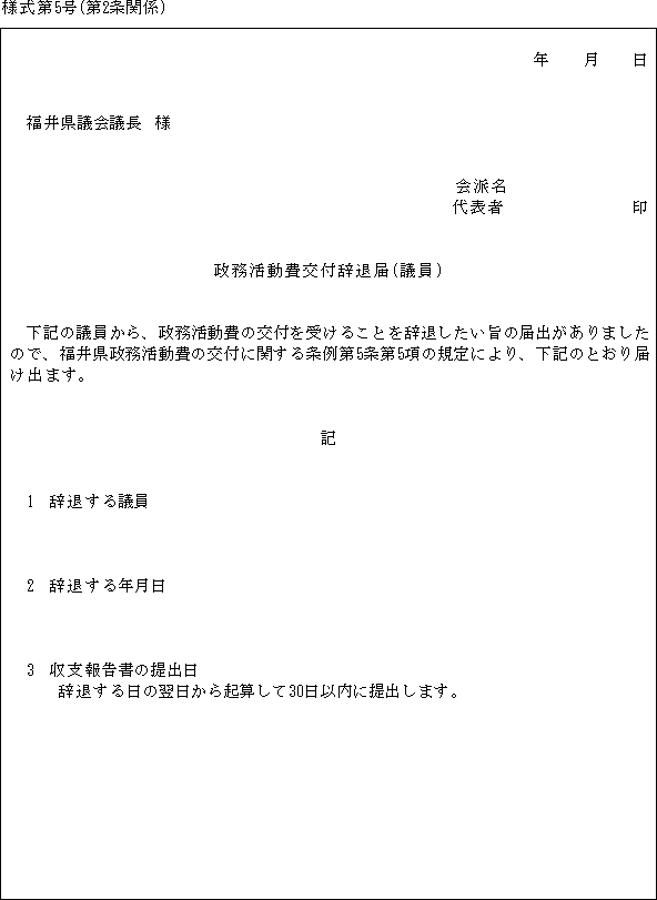 5 条例第5条第5項の規定による届出は、政務活動費交付辞退届(議員)(様式第5号)によりするものとする。