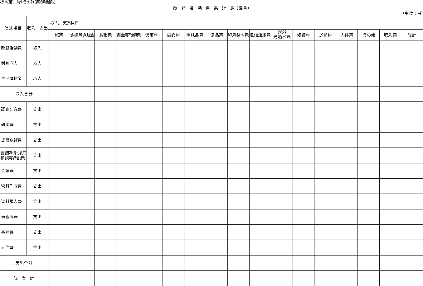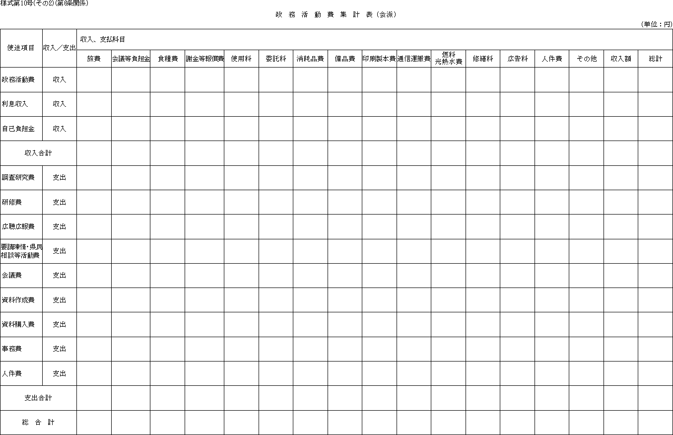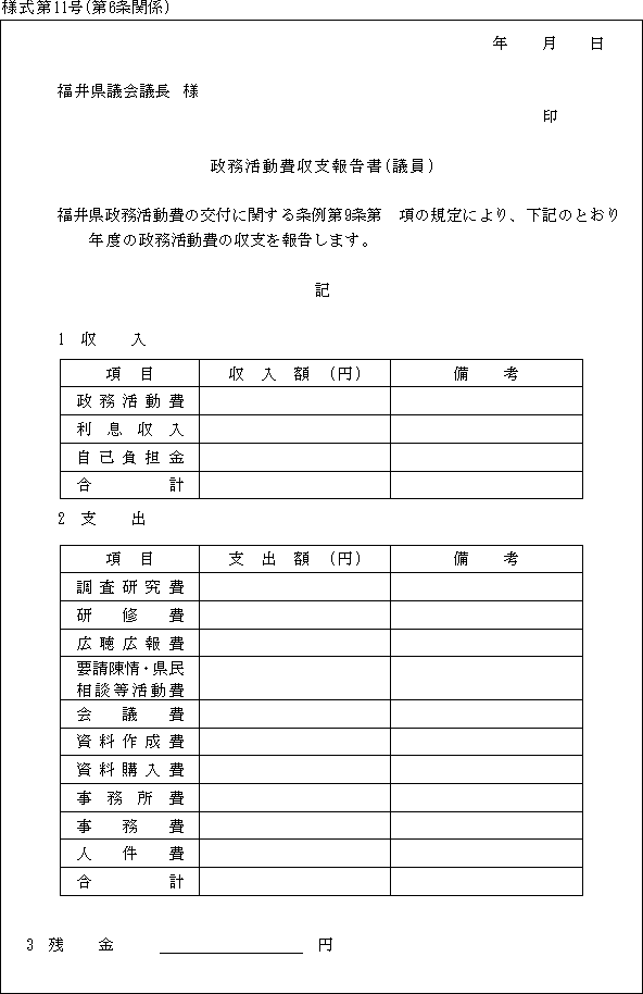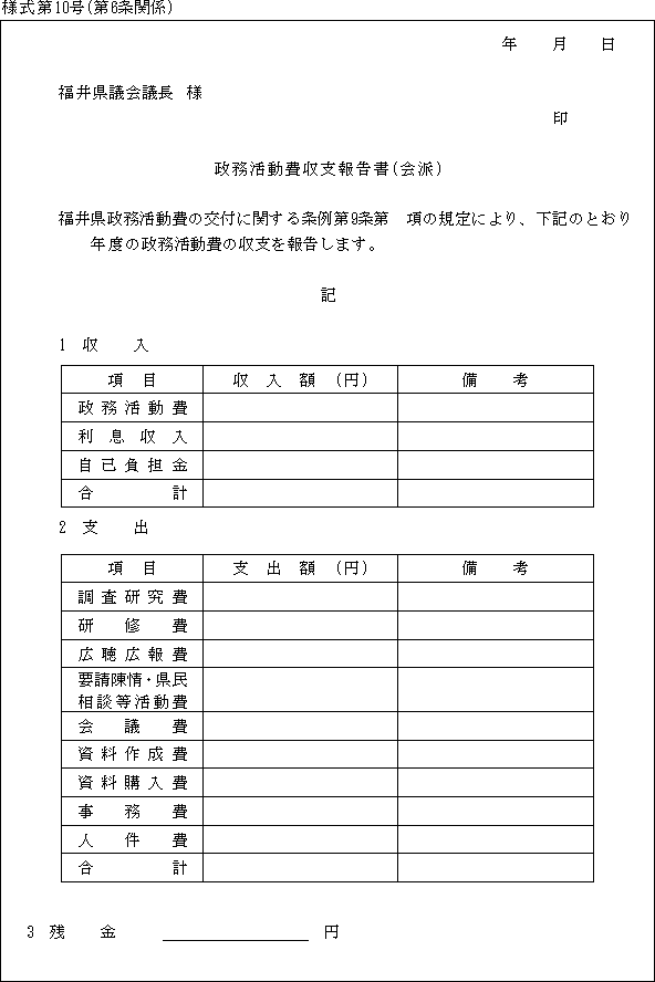 第6条 条例第9条の収支報告書は、会派に係る政務活動費については様式第10号によるものとし、議員に係る政務活動費については様式第11号によるものとする。