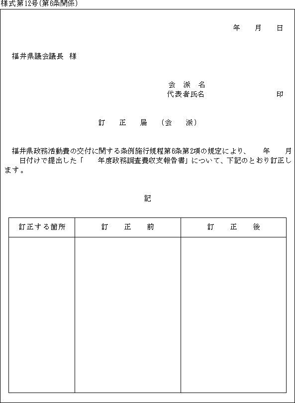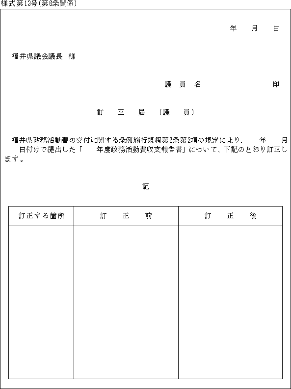 2 収支報告書を訂正しようとする場合は、会派にあっては様式第12号により、議員にあっては様式第13号により、訂正届を議長に提出するとともに、収支報告書の訂正の箇所に認印し、訂正年月日を記載しなければならない。この場合において、削った部分は、これを読むことができるように字体を残さなければならない。