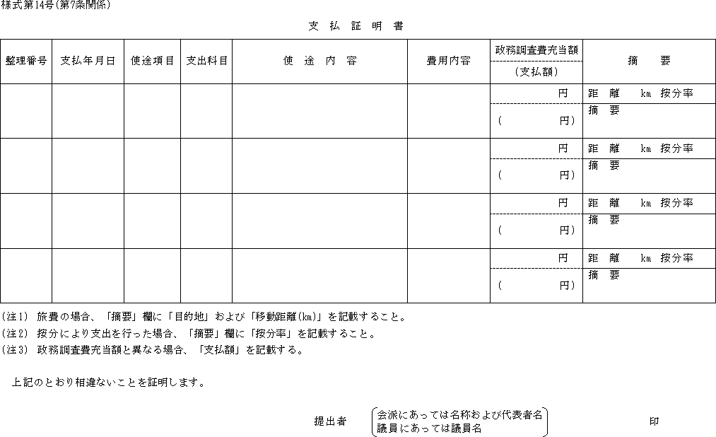 第7条 条例第9条第4項に規定する政務活動費の支出に係る領収書その他の収支報告書の内容を証する書類は、領収書(領収書と同等とみなすことができる書類を含む。以下「領収書等」という。)または支払証明書(様式第14号。領収書等を徴し難い事情がある場合に限る。)および政務活動費の使途内容を証明する書類とする。