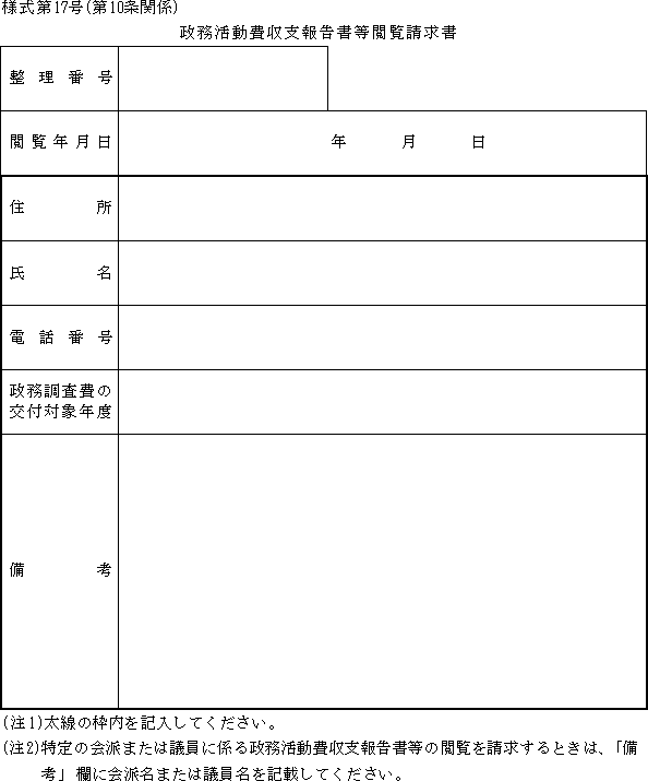 (1) 閲覧をしようとする者は、政務活動費収支報告書等閲覧請求書(様式第17号)を議長に提出しなければならない。